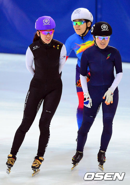 27일 오전 성남 탄천실내빙상장에서 열린 '제95회 전국 동계체육대회'에서 여자 일반부 1500m 경기를 앞두고 (왼쪽)조해리가 동료들과 이야기를 나누고 있다.
