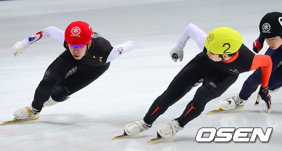 27일 오전 성남 탄천실내빙상장에서 열린 '제95회 전국 동계체육대회' 남자 일반부 1500m에서 (왼쪽)이호석이 역주하고 있다.