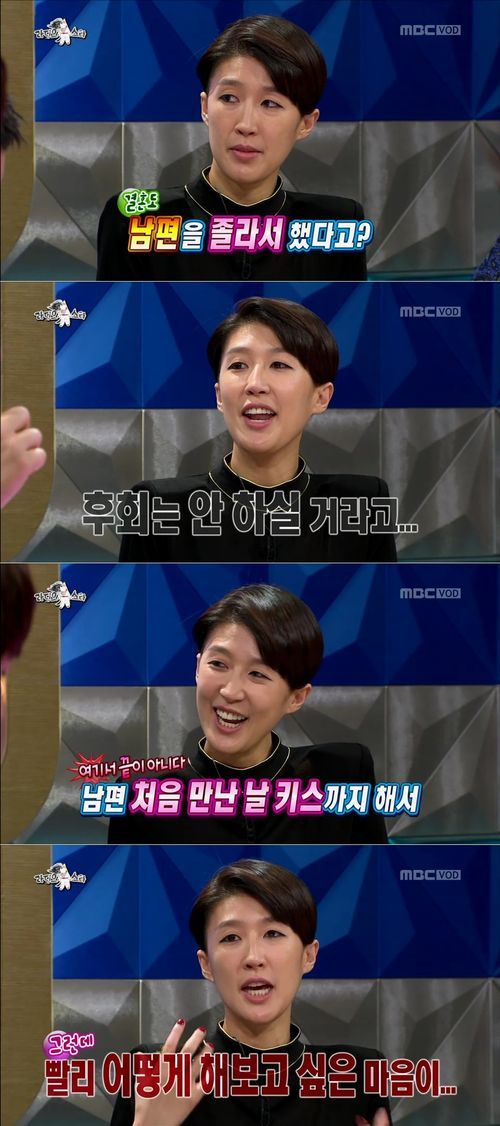 홍진경은 지난 26일 방송된 MBC 예능 프로그램 '황금어장 - 라디오스타'에 출연해 "남편을 처음 만난 날부터 마음에 들어서 급하게 뭔가 해보고 싶었다. 그래서 처음 만난 날에 키스를 해버렸다"고 말했다.