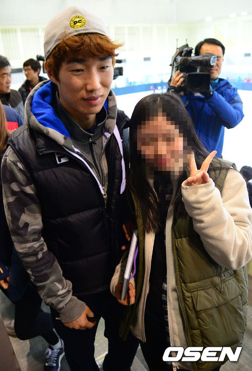 27일 오전 성남 탄천실내빙상장에서 열린 '제95회 전국 동계체육대회' 이한빈이 여성팬과 기념촬영을 하고 있다.