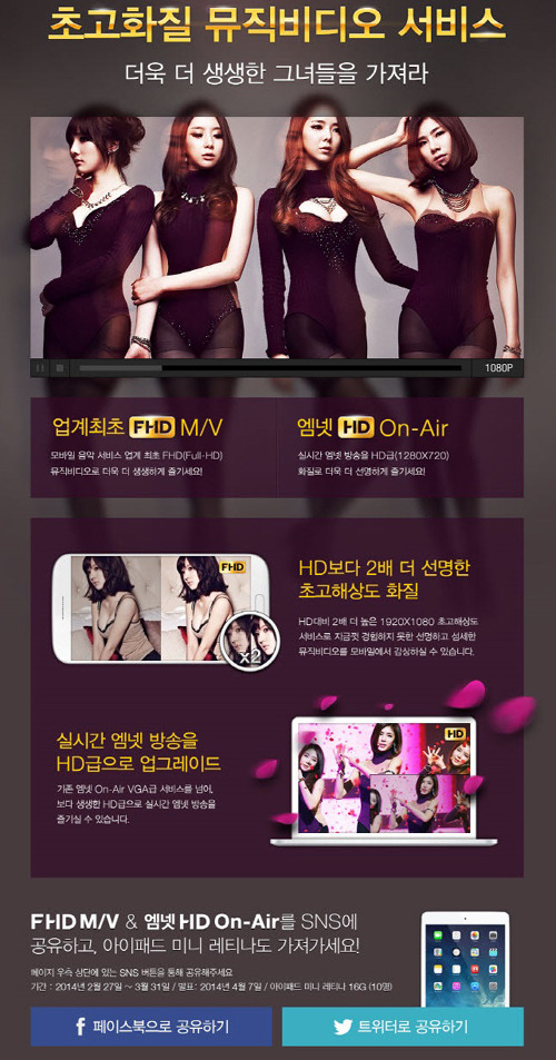 이번에 엠넷닷컴이 출시한 서비스는 ▲HD보다 2배 더 선명한 화질의 영상을 모바일에서 스트리밍으로 감상할 수 있는 ‘모바일 풀HD 뮤직비디오 (Mobile Full HD Music Video)’ 서비스, ▲엠넷의 방송을 HD급 화질로 실시간 감상할 수 있는 ‘HD 온에어’ 서비스 등 두 가지.
