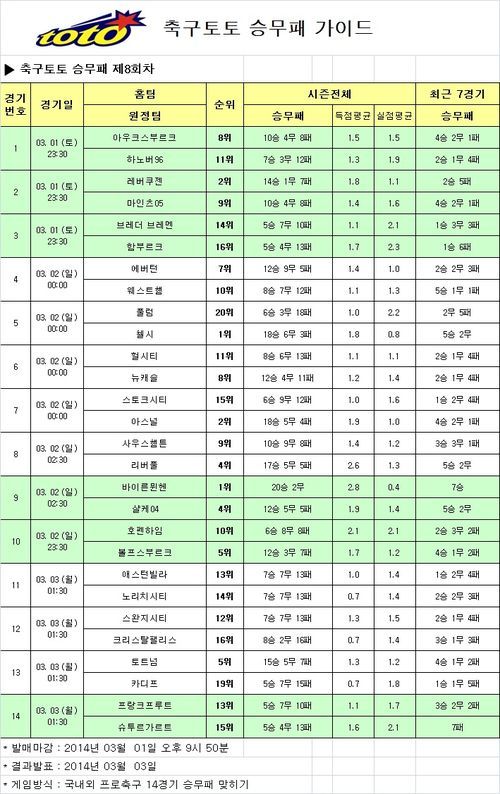 축구토토 승무패 8회차 게임은 내달 1일 오후 9시 50분에 발매가 마감되며 상세한 일정은 스포츠토토 및 스포츠토토 공식 온라인 발매 사이트인 베트맨에서 확인할 수 있다.