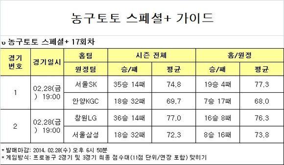 [농구토토] 국민체육진흥공단(www.kspo.or.kr)이 발행하는 체육진흥투표권 수탁사업자인 스포츠토토 공식 온라인 발매 사이트인 베트맨(www.betman.co.kr)이 오는 28일에 펼쳐지는 2013-14시즌 국내프로농구 KBL 서울SK-안양KGC(1경기), 창원LG-서울삼성(2경기)전을 대상으로 한 농구토토 스페셜+ 17회차 투표율을 중간집계한 결과, 2경기 LG-삼성전에서 LG의 완승을 예상한 참가자가 다수를 차지했다고 밝혔다