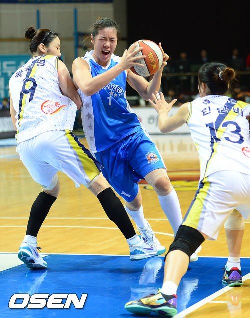 27일 안산 와동실내체육관에서 열린 우리은행 2013-14 여자프로농구 정규리그 6라운드 안산 신한은행과 춘천 우리은행의 경기, 1쿼터 우리은행 양지희가 몸싸움을 하며 파고들고 있다.