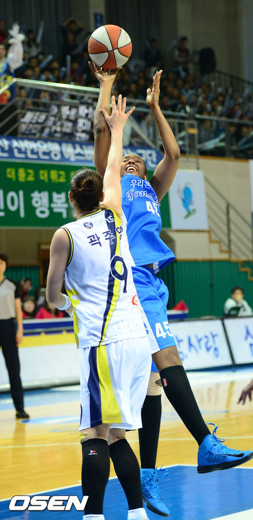27일 오후 안산 와동실내체육관에서 열린 우리은행 2013-14 여자프로농구 정규리그 6라운드 안산 신한은행과 춘천 우리은행의 경기, 2쿼터 우리은행 퀸이 페이드어웨이 슛을 날리고 있다.