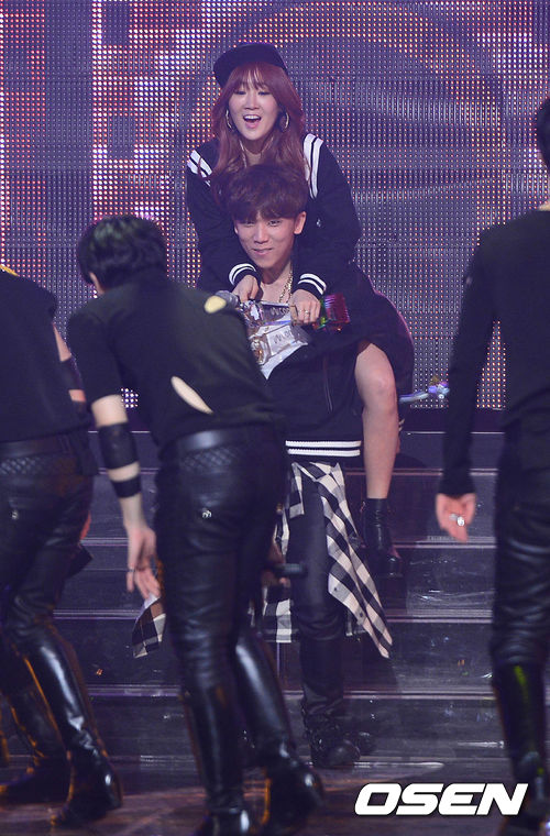 소유X정기고가 27일 오후 서울 상암동 CJ E&M에서 진행된 Mnet '엠카운트다운'(이하 엠카) 생방송에서 1위를 차지한 뒤 공약 세리머니를 선보이고 있다.
