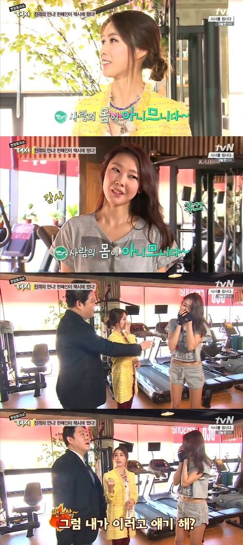 홍은희는 27일 오후 방송된 tvN 예능프로그램 '현장 토크쇼 택시'(이하 '택시')에서 피트니스 클럽에서 운동하고 있는 한혜진의 몸매를 본 후 감탄을 하며 “사람의 몸이 아니다”고 칭찬했다.
