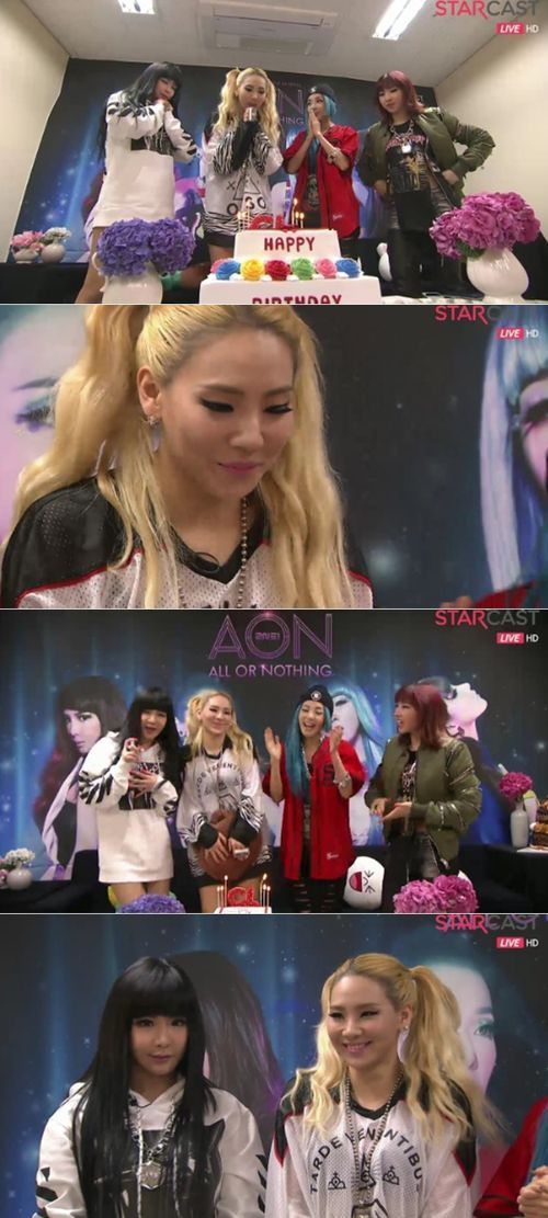 2NE1은 27일 오후 7시 온라인 포털사이트 네이버 라인을 통해 진행된 스타캐스트 온 에어 '2NE1의 올 오어 나싱(ALL OR NOTHING)' 말미에 씨엘을 위한 대형 케이크를 공개했다. 멤버들은 노래를 부르며 씨엘의 생일을 축하했다.