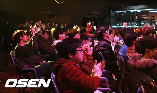 CJ 엔투스와 SK텔레콤 T1이 27일 서울 용산 온게임넷 e스포츠 상설경기장에서 벌어지는 'SK텔레콤 LTE-A 롤 마스터즈 2014 (이하 롤 마스터즈)' 3주차 경기에서 맞붙었다. 용산 e스포츠 상설경기장이 만원 관중으로 가득찼다.
