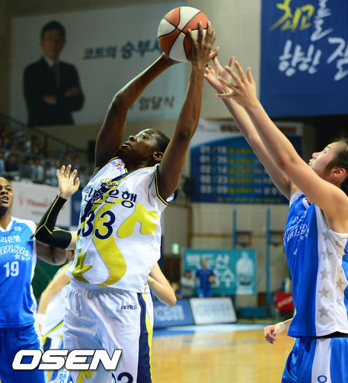 27일 안산 와동실내체육관에서 열린 우리은행 2013-14 여자프로농구 정규리그 6라운드 안산 신한은행과 춘천 우리은행의 경기, 3쿼터 신한은행 스트릭렌이 리바운드 후 골밑 슛을 시도하고 있다.
