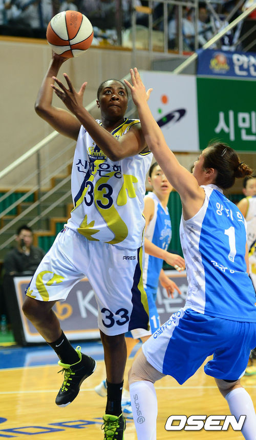 27일 안산 와동실내체육관에서 열린 우리은행 2013-14 여자프로농구 정규리그 6라운드 안산 신한은행과 춘천 우리은행의 경기, 3쿼터 신한은행 스트릭렌이 레이업슛을 시도하고 있다.