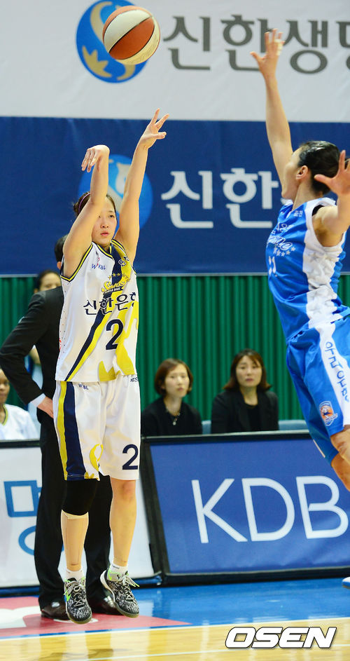27일 안산 와동실내체육관에서 열린 우리은행 2013-14 여자프로농구 정규리그 6라운드 안산 신한은행과 춘천 우리은행의 경기, 3쿼터 신한은행 김규희가 3점슛을 날리고 있다.