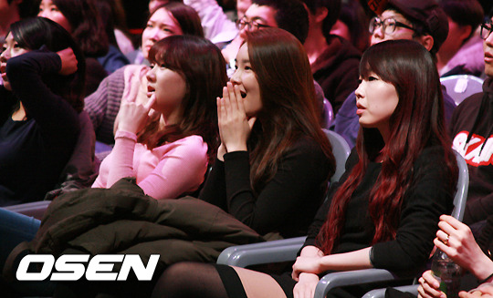 SK텔레콤은 27일 서울 용산 온게임넷 e스포츠 상설경기장에서 열린 'SK텔레콤 LTE-A 롤 마스터즈(이하 롤 마스터즈)' CJ 엔투스와 3주차 경기서 S 이지훈의 활약에 힘입어 1세트를 승리했다. 1세트를 지켜보던 '롤챔스' 리포터 조은나래가 경기에 열광하고 있다.