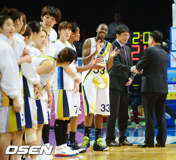 경기를 마치고 신한은행 임달식 감독이 선수들과 함께 기쁨을 나누고 있다. / rumi@osen.co.kr
