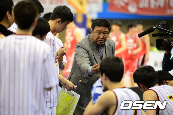 이날 경기를 마지막으로 감독직에서 물러나는 경희대 최부영 감독이 3쿼터 작전타임을 하고 있다.
