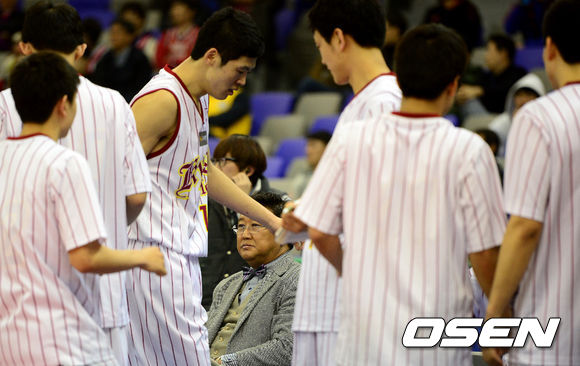 이날 경기를 마지막으로 감독직에서 물러나는 경희대 최부영 감독이 3쿼터 작전타임을 하며 생각에 잠겨 있다.