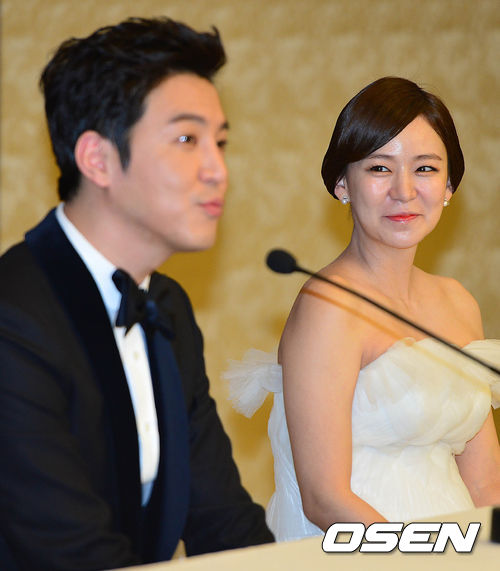 배우 최원영과 심이영이 28일 오후 서울 삼성동 코엑스 워커힐 그랜드볼룸에서 열리는 결혼식을 앞두고 진행된 기자회견에 참석해 취재진의 질문에 답하고 있다.