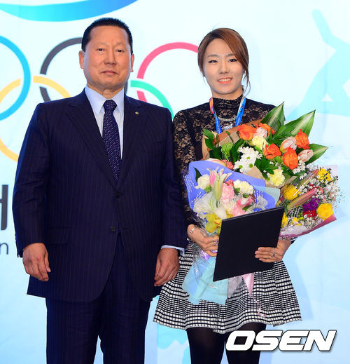 대한체육회 김정행 회장과 체육대상을 수상한 이상화가 포토타임을 갖고 있다.