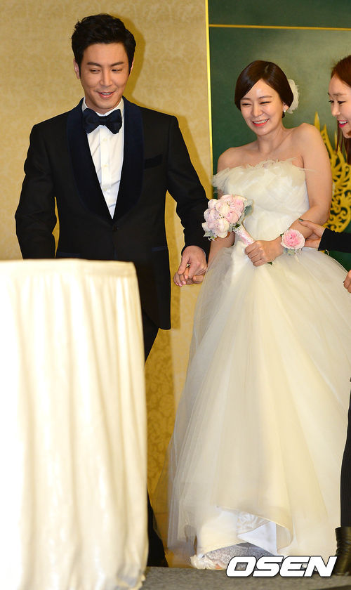 배우 최원영과 심이영이 28일 오후 서울 삼성동 코엑스 워커힐 그랜드볼룸에서 열리는 결혼식을 앞두고 진행된 기자회견에 참석하고 있다.