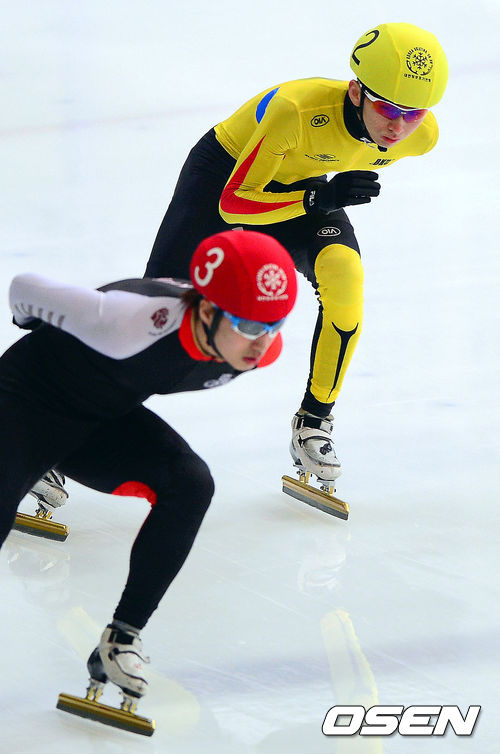 1일 오전 성남 탄천실내빙상장에서 열린 '제95회 전국 동계체육대회' 남자 대학부 1000m 박세영(2번 노란모자)이 역주하고 있다.