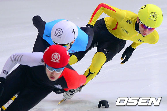 1일 오전 성남 탄천실내빙상장에서 열린 '제95회 전국 동계체육대회' 남자 대학부 1000m 박세영(2번 노란모자)이 역주하고 있다.
