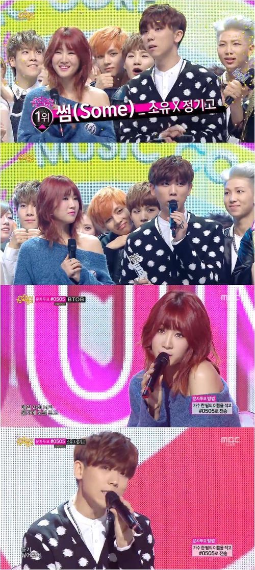 소유와 정기고는 듀엣곡 ‘썸’으로 1일 방송된 ‘쇼! 음악중심’에서 1위를 차지했다. 정기고는 “계속 꿈 같은 일이 벌어지고 있다”고 얼떨떨한 모습을 보였고 소유는 씨스타 멤버들과 팬들에게 고마운 마음을 전했다.