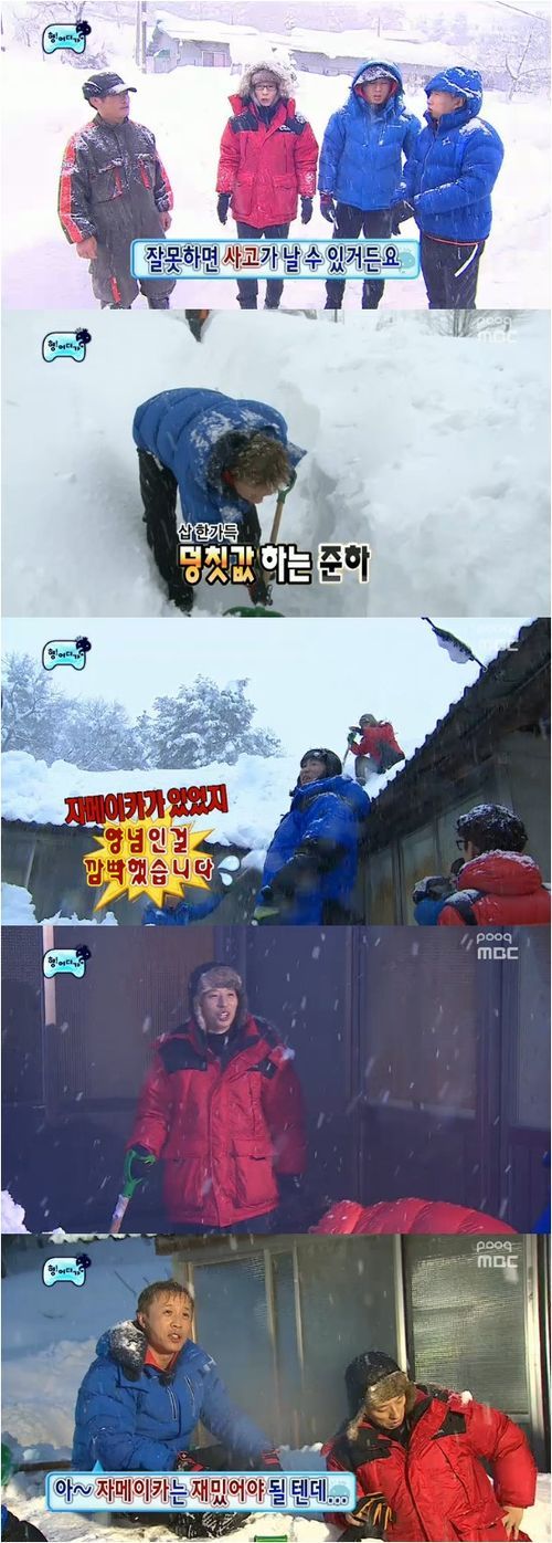 온통 눈으로 쌓인 마을에서 눈을 치우는 일은 고난의 행군이었다. 다음 날 촬영으로 일찍 자리를 떴어야 하는 박명수도 마지막까지 제설에 힘을 썼다. 이들의 제설은 고군분투 그 자체였다. 하늘에서 내린 폭설로 인해 고립된 노인들의 아픔을 헤아리며 제설에 땀을 흘렸다. 특히 유재석은 “우린 양념이다. 주인공은 자메이카 팀이다. 우린 어르신들 돕는 일만 하면 된다”고 웃음보다는 제설에 신경을 쓰는 감동적인 행보를 보였다.