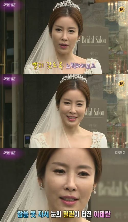 이날 식장에 도착한 이태란은 "아직도 실감이 안난다. 식장으로 들어가봐야 알 것 같다"며 "잠을 못 자서 눈에 혈관이 터졌다. 태어나서 처음 하는거라 긴장되고 떨린다"라고 설레는 소감을 전했다.