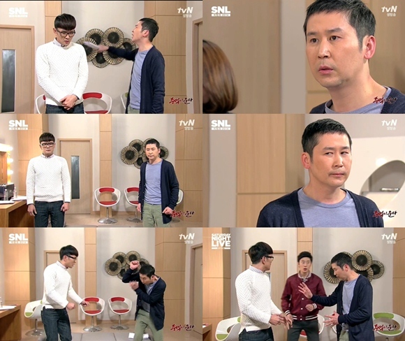 윤형빈은 1일 오후 첫 방송된 케이블채널 tvN 'SNL코리아' 시즌5 '주먹이 운다' 코너에 출연, 신동엽과 호흡을 맞췄다.