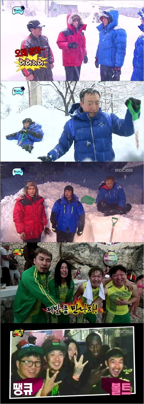 ‘무한도전’은 지난 1일 방송에서 자메이카로 날아간 정형돈, 하하, 노홍철, 스컬이 우사인 볼트를 만나겠다고 그에게 자신들의 자메이카 행적을 일일이 트위터에 남기는 과정을 전했다. 또한 기상 관측 사상 최장 기간의 폭설로 인해 그야말로 일상이 마비된 강원도 오지 마을의 제설을 돕는 유재석, 정준하, 박명수, 길의 모습을 교차적으로 담았다.