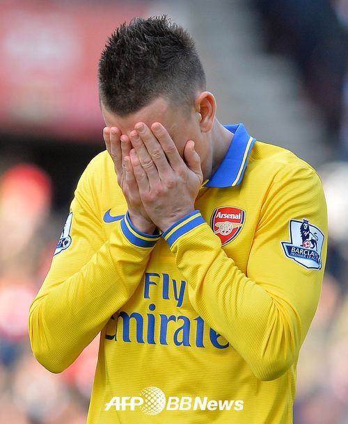 결승골이 된 페널티킥을 내준 아스날의 수비수 로랑 코시엘니(29)가 패배에 괴로워하고 있다.