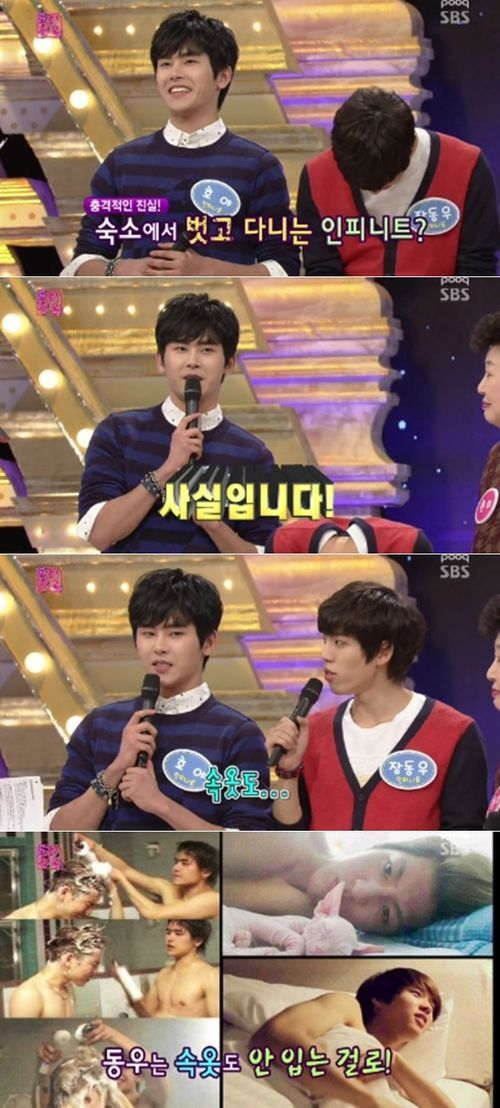 그는 "멤버들이 옷을 잘 안 입어서 가사도우미 분들이 많이 놀랐다더라"는 MC 이휘재의 질문에 "그렇다"고 답하며 "동우는 속옷도 안 입는다. 나머지 멤버들은 속옷은 입는다"고 설명했다.