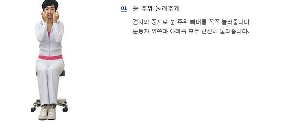 특히 고개를 15도 정도 숙인 채 두 손을 문질러서 손바닥을 따뜻하게 한 다음 안구를 감싸듯 눌러주는 것도 눈의 피로 회복에 효과적인 것으로 알려졌다.