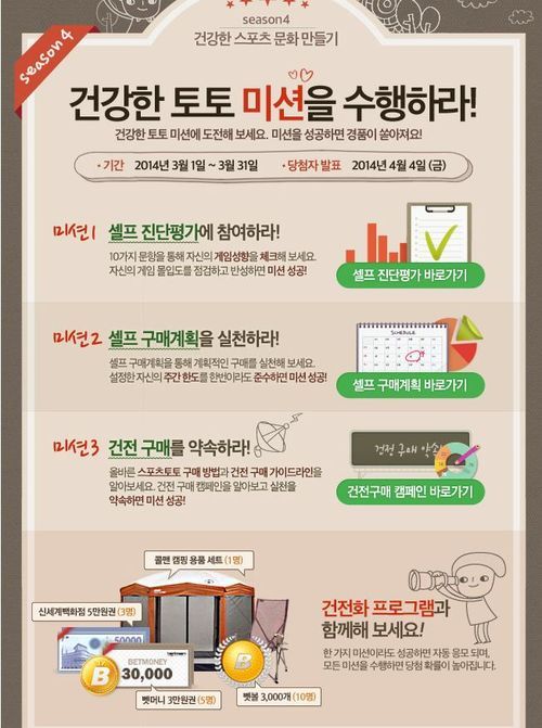 [스포츠토토] 국민체육진흥공단(www.kspo.or.kr)이 발행하는 체육진흥투표권 수탁사업자인 스포츠토토의 공식온라인 발매사이트 베트맨(www.betman.co.kr)이 2월 한 달간 건강한 스포츠문화 만들기 캠페인 시즌4 '건강한 토토 미션을 수행하라!' 이벤트를 실시한다.