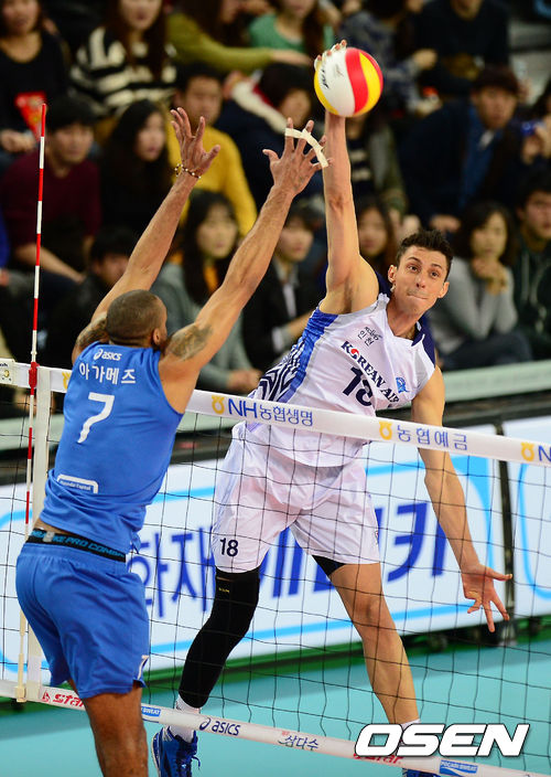 2일 오후 인천 계양체육관에서 열린 '2013-2014 NH농협 V리그' 남자부 대한항공 점보스와 현대캐피탈 스카이워커스의 경기, 대한항공 마이클이 강타를 날릴때 현대캐피탈 아가메즈가 블로킹을 시도하고 있다.