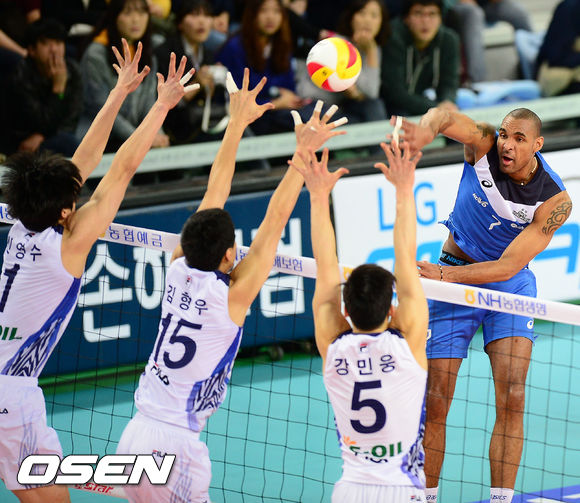 2일 오후 인천 계양체육관에서 열린 '2013-2014 NH농협 V리그' 남자부 대한항공 점보스와 현대캐피탈 스카이워커스의 경기, 현대캐피탈 아가메즈가 강타를 날리고 있다.