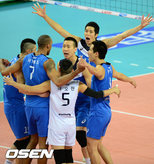 2일 오후 인천 계양체육관에서 열린 '2013-2014 NH농협 V리그' 남자부 대한항공 점보스와 현대캐피탈 스카이워커스의 경기, 현대캐피탈 아가메즈가 공격에 성공한 후 동료들과 기쁨을 나누고 있다.