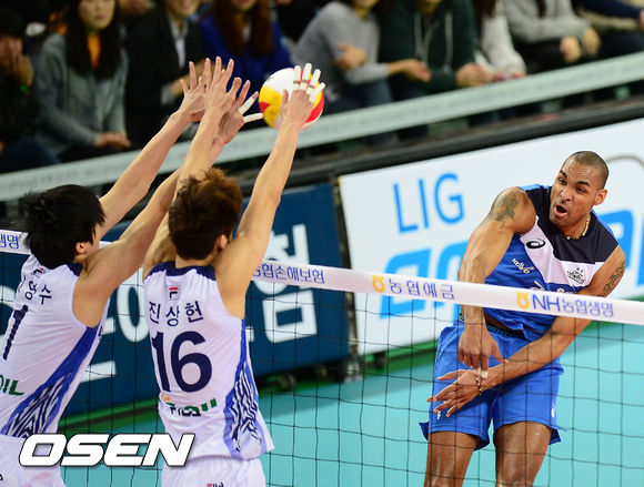 2일 오후 인천 계양체육관에서 열린 '2013-2014 NH농협 V리그' 남자부 대한항공 점보스와 현대캐피탈 스카이워커스의 경기, 현대캐피탈 아가메즈가 강타를 날리고 있다.