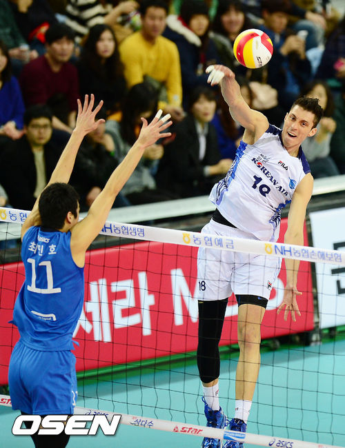 2일 오후 인천 계양체육관에서 열린 '2013-2014 NH농협 V리그' 남자부 대한항공 점보스와 현대캐피탈 스카이워커스의 경기, 대한항공 마이클이 강타를 날리고 있다.