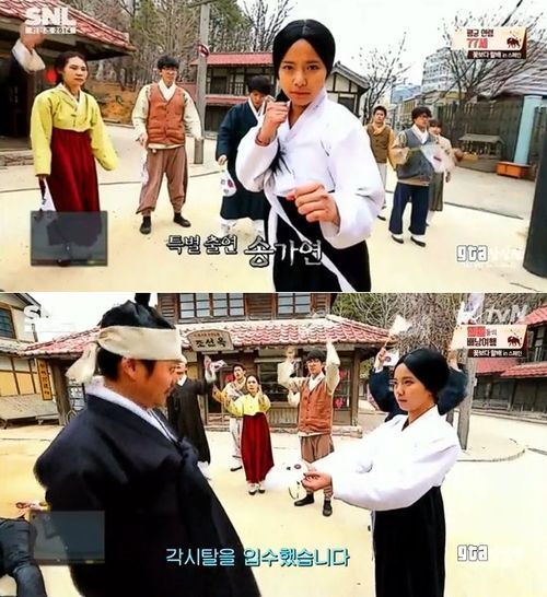 송가연은 지난 1일 방송된 'gta 삼일절'에서 무술에 능한 유관순 캐릭터를 맡아 등장했다. 그는 일본 순사들을 로우킥, 하이킥으로 연타한 후 각시탈을 빼앗는 모습을 연기해 눈길을 끌었다.