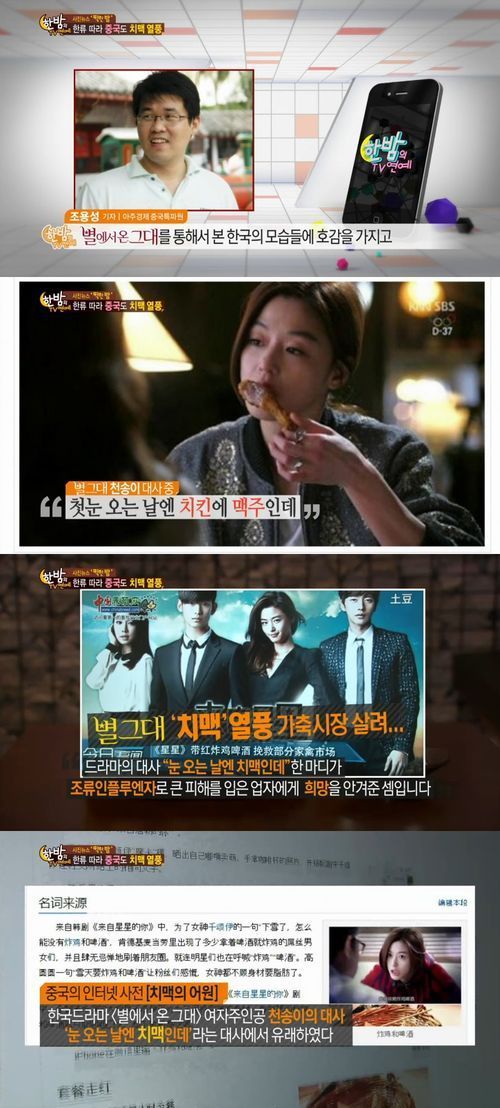 지난달 26일 방송된 SBS ‘한밤의 TV연예’에서는 중국 치맥 열풍에 대해 전했다. 한 중국 특파원은 “‘별그대’를 통해서 본 한국의 모습들에 호감을 가지고 따라 해보고 싶은 마음이 생겨서 치맥을 체험해보려고 하는 사람이 많다”고 밝혔다.