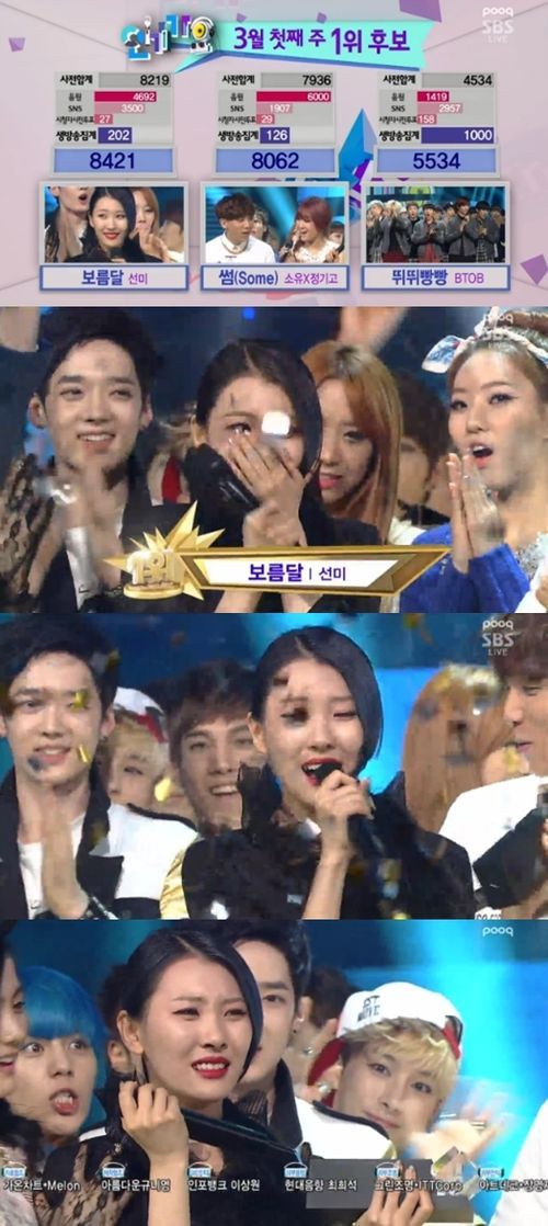선미는 2일 오후 방송된 가요프로그램 SBS '인기가요'에서 '보름달'로 비투비의 '뛰뛰빵빵'과 소유X정기고 '썸'을 꺾고 1위를 차지했다.
