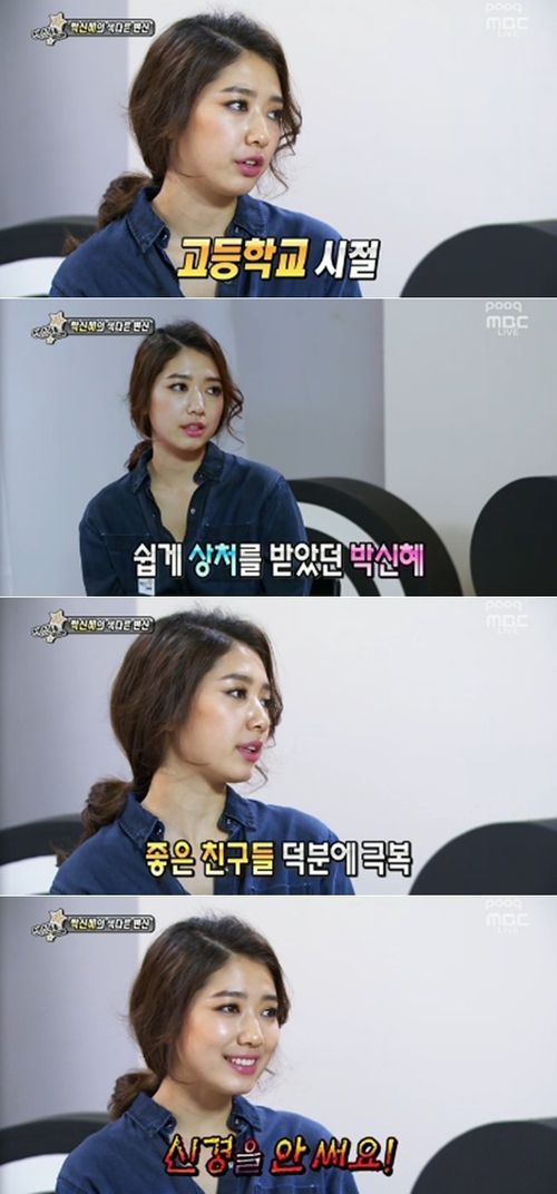 박신혜는 2일 방송된 MBC 예능 프로그램 '섹션TV 연예통신'에 출연해 "고등학교 시절에 쉽게 사람들 때문에 상처를 받아 연기를 포기하고 싶었다. 하지만 좋은 친구들을 만나 극복할 수 있었다"고 말했다.