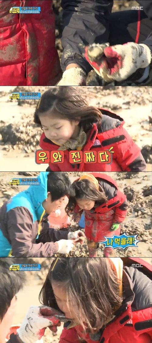 이날 성동일은 "우리 딸 미용에 좋은 굴 좀 캐줘야겠다"며 갯벌 속 굴을 캤다. 이 모습을 지켜보던 성빈은 아빠에게 "나 먹을래"라고 말하며 입맛을 다셨고, 조금의 망설임도 없이 생굴을 흡입해 아빠를 놀라게 했다.