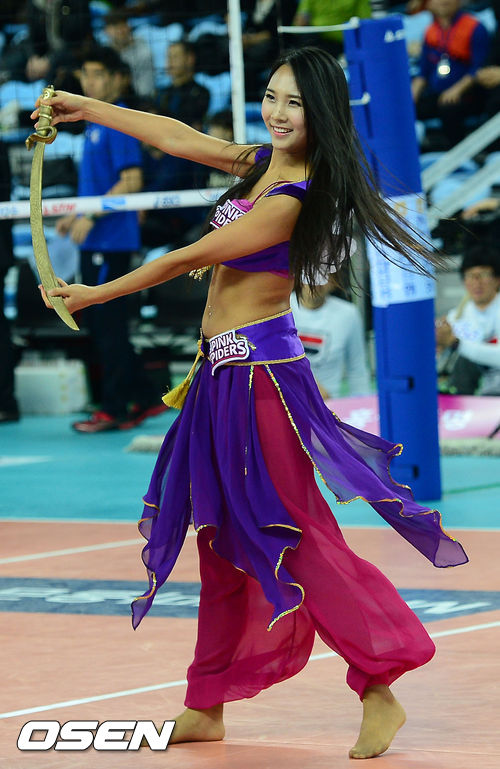 2일 오후 인천 계양체육관에서 열린 '2013-2014 NH농협 V리그' 여자부 흥국생명과 IBK기업은행의 경기, 흥국생명 치어리더가 코트 위에서 화려한 벨리댄스 공연을 펼치고 있다.