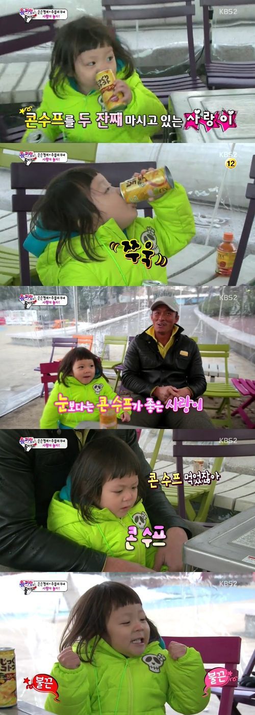 추사랑의 콘수프 먹방은 여기서 멈추지 않았다. 추사랑은 콘수프를 더 달라고 떼를 썼고 결국 자판기에서 콘수프를 뽑아 한 캔 더 먹더니 주먹을 불끈 쥐어 웃음을 자아냈다.