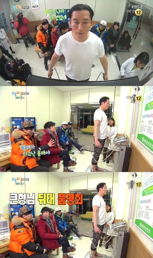 김주혁이 겉옷을 벗고 기계에 올라서자 멤버들은 "타고난 멤버다", "엉덩이가 작다"고 품평회를 해 웃음을 자아냈다.
