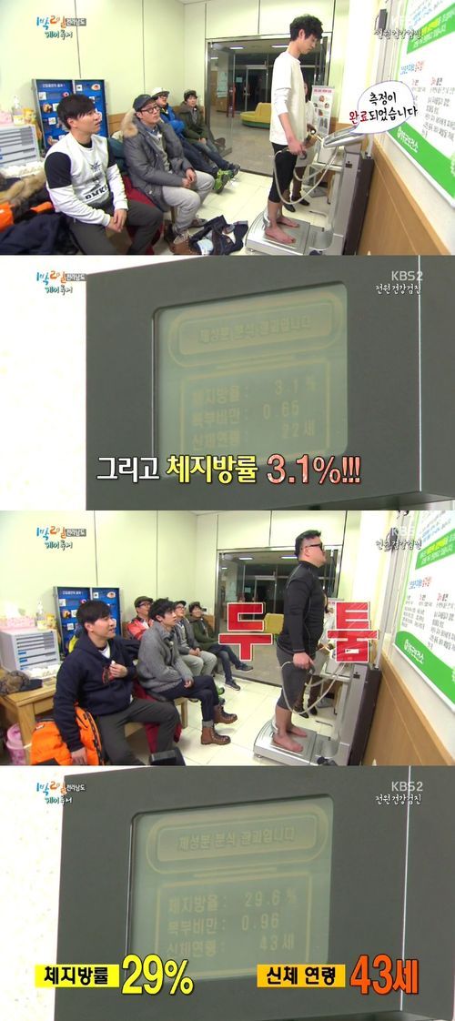 '1박2일'의 데프콘과 정준영이 극과 극 신체나이를 보였다.