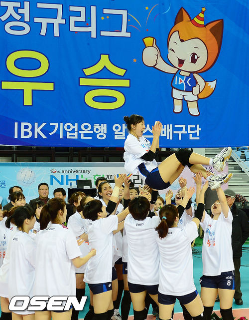 IBK기업은행 이효희가 헹가래를 받고 있다./ rumi@osen.co.kr