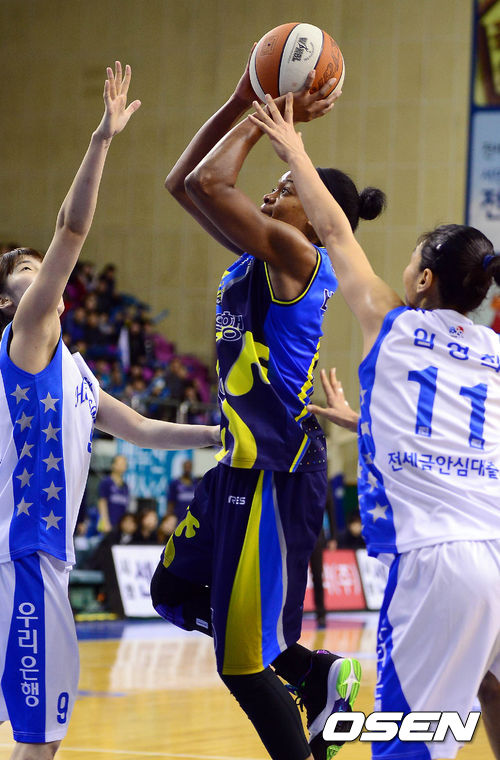 2일 오후 춘천호반체육관에서 열린 '우리은행 2013-2014 여자프로농구' 춘천 우리은행과 안산 신한은행의 경기 1쿼터 엘레나가 미들슛을 시도하고 있다.